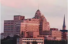 The hospital was completed in November 1931 and cost $1.6 million to construct.[2] Built on a hill near the center of the city, the 12-storey building, topped with a gleaming metal dome, was a prominent landmark in Saint John's skyline.[2][3]