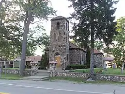 The district consists of a church edifice and a shrine. The district also consists of a cemetery with graves dating back to the 1850s.[2] The church is a fieldstone cruciform-plan structure with a hip roof. A square-plan, hip-roof bell tower at the front contains an entry vestibule. Both the church and tower are topped with a red ceramic tile roof. A 1954 addition in located in one corner of the church.[3]