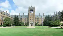 Dedicated in 1926, Le Mans is the second oldest college building. Le Mans Hall is named for a city in northwest France where Blessed Basil Anthony Moreau founded the Congregation of the Sisters of Holy Cross and the Congregation of the Holy Cross (brothers and priests). Le Mans Hall is the administration building (first floor) and a residence hall. Note that Le Mans is two words. Le Mans Tower is the bell tower at the center of Le Mans Hall. At the top of the tower sits a cross. Le Mans Tower is to Saint Mary's College what the Golden Dome is to the University of Notre Dame, a symbol of the institution. Commencement is held each May on Le Mans Green, the south lawn in front of Le Mans Hall.