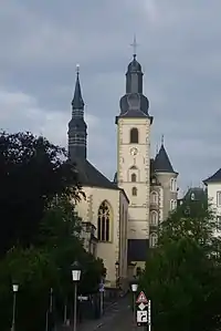 The church is the oldest extant religious site in Luxembourg City.[1] The first church was built on the spot in 987 as the castle chapel for the Count of Luxembourg. However, over the following centuries, the building was destroyed, rebuilt, and renovated several times. Its current appearance dates to 1688, and unites Romanesque and Baroque architectural styles, pre-dating the national Moselle Baroque style.[1] The building has been restored since then, preserving its original form; it has most recently been renovated in the 1960s, 1980s, and 2003–2004.[1]