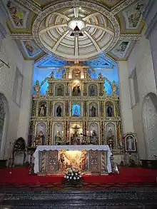 The main retablo is painted in white and has a pantheon of 14 saints housed in an elaborately carved niche with the Archangel Michael towering above. There are two smaller retablos on either side. Father Ronald Reagan constructed an altar marble consecrated by Archbishop Alejandro Olalia in 1959 where the image of the Nuestra Señora de los Dolores was enshrined.[2][5] A pulpit and a large painting depicting the concept of Heaven, Earth, Hell, and Judicium Finale (Final Judgement), created by Jose Dans, a 19th-century artist from Paete, can also be found. A life-sized figure of a crucified Christ is found in a smaller retablo near the church entrance. The church's Stations of the Cross were made by local artists.[9]
