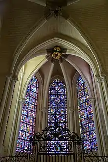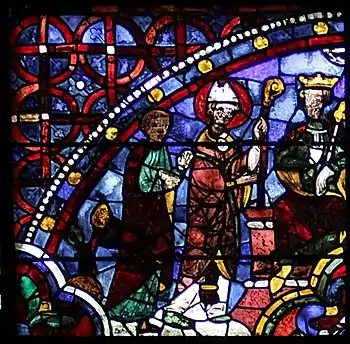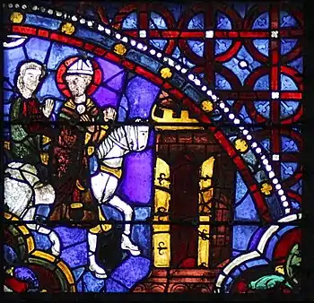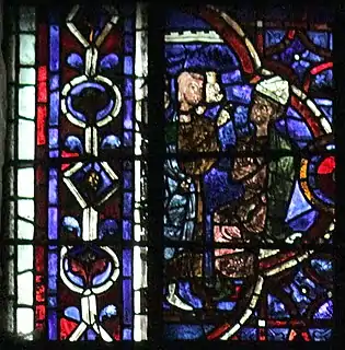 Saint Thomas Becket window in Chartres Cathedral is a 1215–1225 stained-glass window in Chartres Cathedral, located behind a grille in the Confessors' Chapel, second chapel of the south ambulatory. 8.9 m high by 2.18 m wide, it was funded by the tanners' guild.[1] The furthest left of five lancet windows in the chapel, it is difficult to view and is heavily corroded by glass oxidisation, which has made its left side especially hard to read.