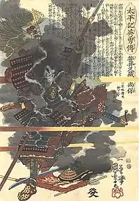 In that battle, he was killed by gunfire. He is one of the samurai depicted in "Tales of Heroes of the Chronicles of the Great Peace", a series of woodblock prints by Utagawa Kuniyoshi.[1]