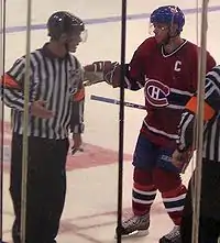 Early in the 2007–08 season in October, Koivu was criticized by nationalist lawyer Guy Bertrand for not speaking French in a videotaped pre-game ceremony. Although Koivu is fluent in English, Swedish and Finnish, he speaks limited French and is apprehensive about using it in public.[11] He replied to Bertrand's remarks that he is not perfect, and jokingly mentioned that he speaks French to his wife during intimate moments.[12] Koivu introduced his team in the next pre-game video with the phrase "Ici Saku Koivu, voici mon équipe" ("Saku Koivu here, this is my team").[11] Later that season, in NHL.com's March 2008 edition of Impact! Magazine, Brian Compton listed the ten best captains of all-time since Steve Yzerman was first named captain of the Detroit Red Wings in 1986; Koivu was included in the article in tenth place, behind the likes of Mark Messier and Mario Lemieux.[13] He finished the season with 56 points. In the subsequent 2008 playoffs, Koivu missed a few games with a broken foot. Nevertheless, he contributed 9 points in 7 games.