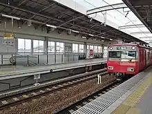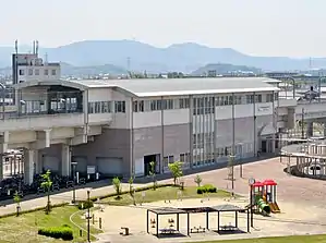 The station is an elevated station with a dual opposed side platforms with the station building underneath. The station is staffed.