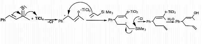 [7]The Hosomi-Sakurai reactions are allylation reactions which involve use of allyl silanes as allylmetal reagents. This section demonstrates examples of allylation of different ketone groups. In figure 1, allylation of a carbonyl ketone (compound containing a ketone group and two different functional groups) has been shown. In the given reaction, the electrophilic compound (carbon with a ketone group) is treated with titanium tetrachloride, a strong Lewis acid and allyltrimethylsilane. According to the general principle, the Lewis acid first activates the electrophilic carbon in presence of allyltrimethylsilane which then undergoes nucleophilic attack from electrons on the allylic silane.[8] The silicon plays the key role in stabilizing the carbocation of carbon at the β-position. Hosomi-Sakurai reaction is also applicable for other functional groups such as enones, where conjugate addition is usually seen. In figure 2, the Hosomi- Sakurai reaction has been shown using a cinnamoyl ketone. This reaction follows the same mechanism as the previous reaction shown here.