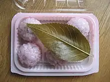 Sakuramochi (桜餅) is a Japanese confection (wagashi) consisting of sweet, pink-colored rice cake (mochi) with a red bean paste (anko) center and wrapped in a pickled cherry blossom (sakura) leaf. Different regions of Japan have different styles of sakuramochi. Kanto-style uses shiratama-ko (白玉粉, rice flour) to make the rice cake, and Kansai-style uses dōmyōji-ko (道明寺粉, glutinous rice flour). The sweet is traditionally eaten during the spring season, especially on Girl's Day (hinamatsuri; March 3) and at flower viewing parties (hanami).[1]