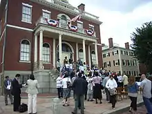 In 1628, Endecott ordered that the Great House be moved from Cape Ann, reassembling it on Washington Street north of Church Street.[15] Francis Higginson wrote that "we found a faire house newly built for the Governor" which was remarkable for being two stories high.[16] A year later, the Massachusetts Bay Charter was issued creating the Massachusetts Bay Colony with Matthew Craddock as its governor in London and Endecott as its governor in the colony.[17] John Winthrop was elected Governor in late 1629, and arrived with the Winthrop Fleet in 1630, one of the many events that began the Puritan Great Migration.[18]