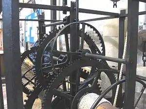 The Salisbury Cathedral clock is a large iron-framed tower clock without a dial, in Salisbury Cathedral, England. Thought to date from about 1386, it is a well-preserved example of the earliest type of mechanical clock, called verge and foliot clocks, and is said to be the oldest working clock in the world,[1] although similar claims are made for other clocks. Previously in a bell-tower which was demolished in 1790, the clock was restored to working condition in 1956 and is on display in the North nave aisle of the cathedral, close to the West front.