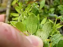 - Leaves usually ovate up to 5 cm long by 3 cm wide; hairless and bright green on upper side; at first densely hairy on lower side, then hairless; margins with numerous small blunt teeth.