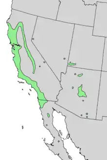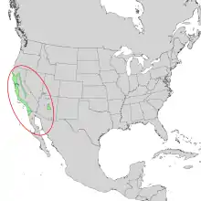 The red willow occurs along the coast of Baja California and in California north to Cape Mendocino. It occurs east of the San Joaquin Valley in the lower elevation western foothills of the Sierra Nevada; it is absent from the Central Valley itself.[1] Small occurrences can be found in Oregon, Nevada, and New Mexico. In Arizona it is found in the central transition zone of the Mogollon Rim and in the central Grand Canyon. Its distribution extends to the Virgin River canyon of southwestern Utah.[1]