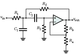 An example of a non-unity-gain bandpass filter implemented with a VCVS filter is shown in Figure 5. Although it uses a different topology and an operational amplifier configured to provide non-unity-gain, it can be analyzed using similar methods as with the generic Sallen–Key topology. Its transfer function is given by