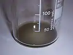Salmiakki Koskenkorva is a somewhat viscous liquid of characteristic black colour, or dark grayish brown when of a thinner consistency. Upon closer inspection, very fine particles of carbon black are visibly suspended in the liquid.