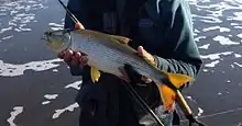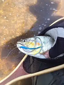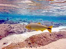 Salminus brasiliensis (dourado, dorado, golden dorado, river tiger or jaw characin) is a large, predatory characiform freshwater fish found in central and east-central South America.[1] Despite having Salminus in its name, the dorado is not related to any species of salmon,[2] nor to the saltwater fish also called dorado. It is very popular among recreational anglers and supports large commercial fisheries.[3]