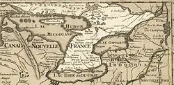 In 1615, French explorer Samuel de Champlain and Jesuit missionaries, including Simon Le Moyne, explored the river and the surrounding area, which would be claimed as part of New France.[5] Early maps and accounts refer to the river by its French name of La Famine, a name referencing the hunger of French colonists who passed through the area in 1656;[16] an Iroquois settlement known as Cahihonovage (or Cahihonovague) was also on noted on its south shore, near present-day Port Ontario.[19] La Famine was described as a "well-known stopping-place upon the eastern shore of Lake Ontario for the weary hunter and the bold explorer, and the spot where even armies encamped, and the ambassadors of hostile nations met in solemn council."[18]