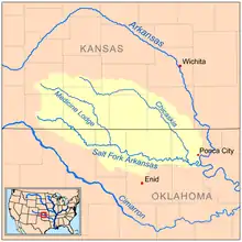 The Salt Fork of the Arkansas River is a 239-mile-long (385 km)[3] tributary of the Arkansas River in southern Kansas and northern Oklahoma in the United States. Via the Arkansas River, it is part of the watershed of the Mississippi River.