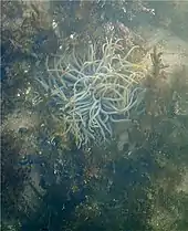 At low tide, sandy areas are exposed between the rocks and these support a fauna characteristic of sediment shores including Common starfish Asterias rubens and burrowing animals such as the Razor shell Ensis arcuata, the Thin tellin Tellina fabula and the Sea potato Echinocardium cordatum.[1]