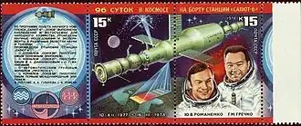 In the wake of Soyuz 25's failure to dock with the orbiting Salyut 6 space station, Soyuz 26 was launched with the aim of docking at the other port, the aft port. The two-man crew of Romanenko and Grechko was launched 10 December 1977, the first launch window following the failed mission.[1] Grechko's presence on the flight arose out of the Soyuz 25 failure. A decision to no longer fly all-rookie crews made him the replacement engineer for Soyuz 26.[1] The launch was almost delayed by bad weather in the Atlantic Ocean where the tracking ship Cosmonaut Yuri Gagarin was stationed. Once the ship's antennae were locked into position, the Soyuz launch was set to launch as the ship was needed to relay the docking procedure to mission control.[2] The crew docked the next day, checked the seals and opened the hatches to the station, the first crew to enter the station. It was only upon the announcement of this successful docking that the Soviets revealed the station had a second port. The Soyuz 26 spacecraft remained docked until January 1978, when it landed the crew of EP-1.