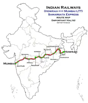 The 12151 / 12152 Lokmanya Tilak Terminus–Howrah Samarsata Express runs from Lokmanya Tilak Terminus via Kalyan Junction, Igatpuri, Nashik Road, Bhusaval Junction, Akola Junction, Nagpur Junction, Gondia Junction, Bilaspur Junction, Rourkela Junction, Purulia, Adra Junction, Bankura, Midnapore, Kharagpur Junction to Howrah Junction.