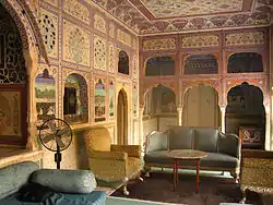 The haveli is built facing north. It has an elegant painted dining room and an air passage. It has a unique ambiance of the historic juxtaposed against a contemporary setting. An elephant ramp, specially constructed at the entrance to the haveli, was laid in 1940 on the occasion of the marriage ceremony of a member of the Royal family.[7]