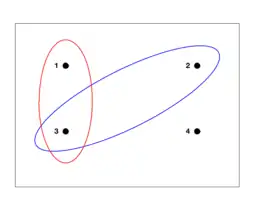 A visual representation of a finite sample space and events. The red oval is the event that a number is odd, and the blue oval is the event that a number is prime.
