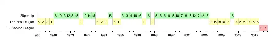 - TFF First League (23 seasons): 1965–1969, 1975–1976, 1979–1982, 1983–1985, 1990–1991, 1992–1993, 2006–2011, 2012–2018, 2020-