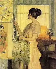 Interior with Figure (1920) is considered to be Baker's most famous work. In it, a woman in profile holds up a small hand mirror, silhouetted against a curtained window.[8] It won the Corcoran Gallery of Art's William A. Clark Prize in 1921, and was awarded a silver medal at the Corcoran's Biennial Exhibition of 1921.[3][9] It made its New York debut in the National Academy Museum and School's winter exhibition in 1923.[3] The Corcoran Gallery of Art purchased the painting in 1936.[10]
