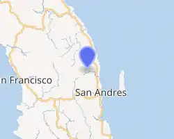 San Andres in the province of Quezon is a fourth class municipality situated 128 kilometres (80 mi) east-southeast of the provincial capitol of Lucena City. Administratively, the town of San Andres is subdivided into seven barangays. Poblacion forms the center, whereas the other six are in the outlying areas which are several kilometres away from the center of the municipality. The municipality also includes the island barangay of Alibijaban in the Ragay Gulf.