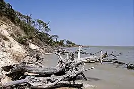 The Karankawa Indians used the land near the Guadalupe River delta and San Antonio Bay for camping purposes.[2] They also populated Matagorda Island on the opposite side of the bay. Captain Luis Cazorla of Presidio La Bahía crossed San Antonio Bay to visit the island in 1776, and discovered that the Indians had killed the mates of a shipwrecked British trading vessel.[3] For a short time, he convinced the Indian leaders not to kill shipwreck survivors on the island. An effort was made to convert the Indians with the establishment of Mission Refugio on San Antonio Bay in 1793, after Fray José Francisco Garza found a shallow crossing that the Indians used to travel to the mainland. To prevent the Indians from using Matagorda Island as a hiding place to stage attacks, La Bahía commandant Juan Cortés burned and cut brush around the point of crossing. No permanent colony was ever established on the island.[4]