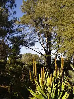Of particular interest is the maturing Cork Oak (Quercus suber) forest. Paths wind through a cluster of twisted and majestic Cork Oaks. Cork Oaks groves in other parts of the world are still harvested for their cork (bark) that is used in for corks placed in wine bottles, as well as for purses, jewelry and wallets.