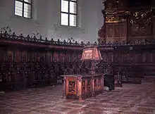 The 102 wooden choir stalls are an exquisite example of Renaissance carving by the Dominican friar Damiano da Bergamo. (1528–1530). Between 1541 and 1549 they were inlaid with intaglia by the same artist, using a series of drawings from a book by Giacomo Barozzi da Vignola, and carved by his brother Stefano da Bergamo. The work was finished by brother Bernardino da Bologna. These decorations display scenes from the Old Testament (on the right side) and from the New Testament (on the left side). Because of its extraordinary artistic value, this remarkable marquetry work was considered by its contemporaries as the eight wonder of the world. It is also noted in the Vite (IV,94) by Giorgio Vasari