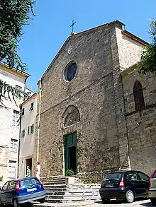 The plain stone church was built in the 13th century for a community of Franciscan friars. The interior has marble monuments to members of the aristocratic family of Counts Guidi, who were patrons of the order. The monument to bishop Guidi (1588) was designed by Felice Palma. Among the paintings in the altars flanking the nave is a Concession (1585) by Giovanni Battista Naldini, a Nativity (1591) by Giovanni Balducci, a Crucifixion attributed to Bartolomeo Neroni, and a Crucifixion (1602) painted by Cosimo Daddi. The paintings of the Circumcision of Christ (1490-91) by Luca Signorelli[1] and the stunning masterpiece of the Deposition (1521) by Rosso Fiorentino are no longer here, the church for which they were painted; the former is in the National Gallery of London, while the latter has been moved to the Pinacoteca Civica of Volterrra. The baptismal font was sculpted by Giovanni Battista Bava in 1552.