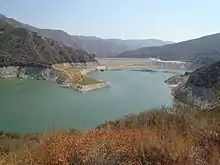 Below the confluence of the East Fork and West Fork, the San Gabriel River flows through the deep San Gabriel Canyon, the only major break in the southern part of the San Gabriel Mountains.[13] Although this stretch of the river was once free-flowing, today is it impounded by major reservoirs for water supply and flood control. San Gabriel Dam, a 325-foot (99 m) high rockfill dam, forms the 44,183-acre-foot (54,499,000 m3) San Gabriel Reservoir.[17] The concrete gravity Morris Dam, just downstream, creates the 27,800-acre-foot (34,300,000 m3) Morris Reservoir. A small hydroelectric plant in the city of Azusa is supplied with water from a diversion of the San Gabriel River, located directly below San Gabriel Dam.