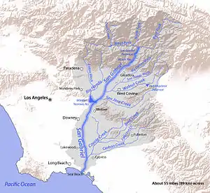 San Jose Creek is an intermittent, tributary stream of the San Gabriel River in Los Angeles County, California. The mouth of San Jose Creek is at an elevation of 194 feet / 59 meters at its confluence with the San Gabriel River, 3.5 miles (5.6 km) southwest of Bassett, California. Its source is at 960 feet near the Los Angeles County Fairplex, at 34°04′50″N 117°45′38″W, where it has its confluence with Thompson Wash,[1] actually a continuation of the creek into the San Gabriel Mountains. From Thompson Wash, San Jose Creek flows nearly 20 miles (32 km) westwards from Pomona into the San Gabriel River through the Pomona Valley and San Gabriel Valley.[2]