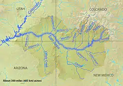 The San Juan structural basin is generally the east portion of the San Juan River Watershed of 24,600 sq mi (64,000 km2) which extends farther west into Utah and Arizona.[1]