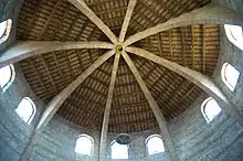 The interior has a circumferential ambulatory delimited by sixteen columns with corinthian capitals. The interior has some notable early Christian symbolism, including a pentagram at the entrance and some crosses belonging to Knights Templar order.[1]