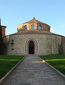 San Michele Arcangelo, also known as Sant'Angelo, is a paleo-Christian temple in the city of Perugia in Umbria. The circular building dates to the 5th to 6th century, and incorporates corinthian capped columns from a prior pagan temple. It is dedicated to the Archangel Michael, whose churches were often located in elevated spots. The small round church is also often called Tempio or Tempietto, and is located in the neighborhood Borgo Sant'Angelo, near the ancient northern gate (Porta Sant'Angelo) of the city.