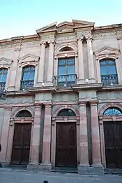 The Casa del Mayorazgo de la Canal dates from the 18th century, constructed by Mariano Loreto de la Canal y Landeta.[4] During the late colonial period, this house was the most important secular building, being home to the De la Canal family, one of the wealthiest in New Spain.[31][33] The original construction was inspired by French and Italian palaces of the 16th to 18th centuries. The house is considered to be a transitional work between Baroque and Neoclassical,[14] as its façade was redesigned by Manuel Tolsá in the early 19th century.[4] The façade is Neoclassical with the coat of arms of the family. The main portal has two levels with an arch and a relief of an eagle on the keystone. The main door is profusely decorated with high reliefs.[4] Today, it houses the Casa de Cultura de Banamex (Banamex Cultural Center), which houses a collection of historic paintings and offers diverse expositions during the year.[36][34]