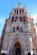 La Parroquia de San Miguel Arcángel, the current parish church of San Miguel, is unique in Mexico and the emblem of the town.[29] It is one of the most-photographed churches in Mexico and the two tall towers of its neo-Gothic façade can be seen from most parts of town.[34] The church was built in the 17th century with a traditional Mexican façade. The current Gothic façade was constructed in 1880 by Zeferino Gutierrez, an indigenous bricklayer and self-taught architect. It is said Gutierrez's inspiration came from postcards and lithographs of Gothic churches in Europe; however, the interpretation is his own and more a work of imagination than a faithful reconstruction.[4] In front of this façade is a small atrium, which is guarded by a wrought iron fence. There is a monument in the atrium dedicated to Bishop José María de Jesús Diez de Sollano y Davalos.[4] The San Rafael or Santa Escuela Church is located to the side of the parish. It was founded by Luis Felipe Neri de Alfaro in 1742. The main façade has two levels with arches, pilasters, floral motifs and a frieze on the first level. The second level has a choir window framed by pink sandstone. The bell tower is Moorish.[4] According to legend, this older chapel was the site of the first Christian ceremony in San Miguel.[34]