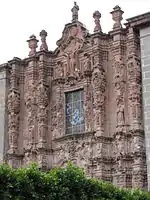 The Oratorio de San Felipe Neri Church was built by Juan Antonio Perez Espinosa in 1712. This church was partially built by incorporating a former chapel used by the mulatto population of the town. That church became the chapel on the east side.[34] The façade is of pink sandstone in Baroque style with profuse vegetative ornamentation.[4] The decorative work of the portal also contains indigenous influences.[9] The interior of the church has a number of paintings by Miguel Cabrera, including one of the Virgin of Guadalupe signed by him. The sacristy contains this last painting along with others depicting the life of Philip Neri. This room is cordoned off by a grate covered with leather from Córdoba, Spain.[4] At the back there is a Baroque chamber/chapel dedicated to the Virgin of Loreto. This chapel was sponsored by Manuel Tomás de la Canal in 1735. It is richly decorated with three altars covered in gold leaf and is a replica of the Basilica della Santa Casa (English: Basilica of the Holy House) of Loreto, Italy.[7][34]
