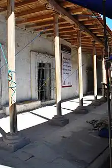 The town has two churches, one dedicated to Saint John the Apostle and the other dedicated to Saint Paul.[1] When the Spanish arrived in the 1520s, nothing rivaled pre-Hispanic Mitla as a religious center in the Oaxaca Valley. In 1544, the church of San Pablo was established on part of the ruins of the old Zapotec religious complex. The church sits on a pre-Hispanic platform which now functions as the atrium.[6] Access to the church is through a portal decorated with pyramid-shaped crests and a niche.[1] The church is 39 meters long and twelve wide, with three naves enclosed by lanterned octagonal domes. The vaults were constructed later, perhaps in the 19th century. The squared apse is closed with a circular dome and cupola is not as high as the nave and is likely from the 16th century. Behind it is a larger octagonal dome that encloses the sanctuary, with one other dome enclosing the choir. The wall of the south atrium was originally part of a pre-Hispanic structure and still contains the mosaic fretwork which defines the Zapotec site.[6] The interior of the church is notable for a large number of 16th-century and other colonial-era santos (statues of the saints), many of them done in well-preserved polychrome.[7]
