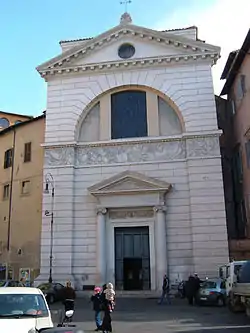 Records claim the church at the site was founded by the early 12th century, other records note founding by Pope Honorius III in 1216.[8] In 1418, the church was rebuilt by Alessandro Savelli, who had an adjacent palace. Some notes indicate it was linked to a group of English priests. By 1621, it was restored by the fathers of the Scuole Pie (Piarists) of St Giuseppe Calasanzio, who lived in the adjacent convent. His room is preserved. His relics are held in a porphyry urn in the church. In 1808, under the patronage of Duke Giovanni Torlonia, a facade was commissioned from the architect Giuseppe Valadier.[9]