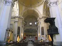 The layout of the church is that of a Latin-Cross. The present structure, built between 1650 and 1690, owes its design to Pietro De Marino and Giovanni Mozzetta.