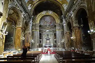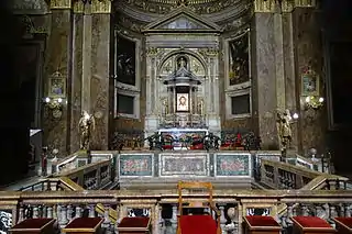 It was rebuilt by the architects Francesco Capriani da Volterra and Carlo Maderno during 1591–1601, and subsequently restored in 1681.[3] The relics of Pope Sylvester I, Pope Stephen I and Pope Dionysius were exhumed and re-enshrined beneath the high altar when the new church was consecrated in 1601. The church also contains the relics of Tarcisius.