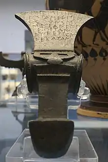 The San Sosti Axe-Head is an ancient bronze head of an axe that was originally found near the town of San Sosti, province of Cosenza in Calabria, southern Italy. Based on its Ancient Greek inscription, it is now considered to be an elaborately crafted votive offering to the gods.[1]
