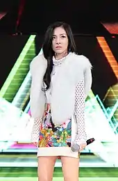 Park features some of the most iconic and memorable styles in the Korean industry, ranging from her signature tail lilt eye make-up, to her bold hair styles and clothing.[98][99] Labeled a pioneer of unconventional trends, her first appearance in Lollipop sporting her 'palm-tree' hairstyle became the most famous and widely parodied style in 2009 and remains an iconic piece in K-pop.[100][101] In particular, her 2012 look, for which she had shaved a portion of her trademark locks for the promotional single "I Love You", attracted massive media attention and initially garnered mixed reactions, but was nonetheless praised for its shock factor and contradictory styling to the typical girl-group 'look'.[102][103] The style is considered to be her most noteworthy transformation.[104]