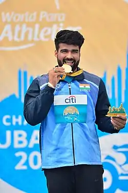 ![]() Chaudhary winning gold at the 2019 Dubai World Para Athletics Championships | |