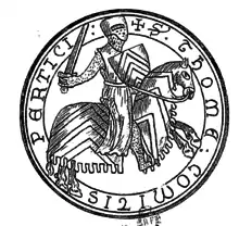 - Inspeximus by Roger de Quency [Quincy], Earl of Winchester, Constable of Scotland, of the grant by Agnes Neyrnut, Dame of Penitune [Peniton], daughter of Henry de Ponte Audemer, widow of Sir Richard Neyrnut, to the Prior and Canons of the Church of Saint John the Baptist of Sandelford [Sandleford], of lands, rents etc, in Westhildesleg [West Ilsley], and also of the advowson of the Church of the same place; and also of lands in Sutton, in Wolesham, and in Walingeford [Wallingford] for the maintenance of a Canon for the souls of herself, her husband, her father, and Matilda, her mother, and of William, her son, at a rental of one penny to herself. Witnesses to the original grant: Sir Nicholas de Henreth, Sheriff of Bercsyre [Berkshire], Sir Alan de Fernham, Sir Walter de Ripariis, Sir Peter de Etingedene, Sir William de Brutenoles, Kts, John Belet of Eneburne, Elias de Bagenore. Witnesses to inspeximus and confirmation: Sir Robert de Quency his brother, Ernaldus de Bosco, William de Bosco, Saher de St Andrews, Peter le Poter, Vrienus de St Peter, Alan de Farnham, Walter de Ripariis, Peter de Hetingdno, Richard de Henreth, Knights, Elias de Bagenore, Geoffrey de Wancy, John de Bruer, Robert de Turberuile, Henry de la Beche.[44]