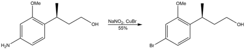 One of the most important uses of the Sandmeyer reaction is the formation of aryl halides. The solvent of choice for the synthesis of iodoarenes is diiodomethane,[18][19] while for the synthesis of bromoarenes, bromoform is used. For the synthesis of chloroarenes, chloroform is the solvent of choice.[20] The synthesis of (+)-curcuphenol, a bioactive compound that displays antifungal and anticancer activity, employs the Sandmeyer reaction to substitute an amine group by a bromo group.[21]