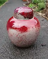 In England the Ruskin Pottery in Smethwick achieved a glaze around 1900; all their formulas were deliberately destroyed when the pottery closed in 1935.[21] Another English art pottery which produced sang de boeuf was that of Bernard Moore. His pottery in Stoke-on-Trent specialised in flambé glazes from 1905 till the closure of the business in 1915.[22]